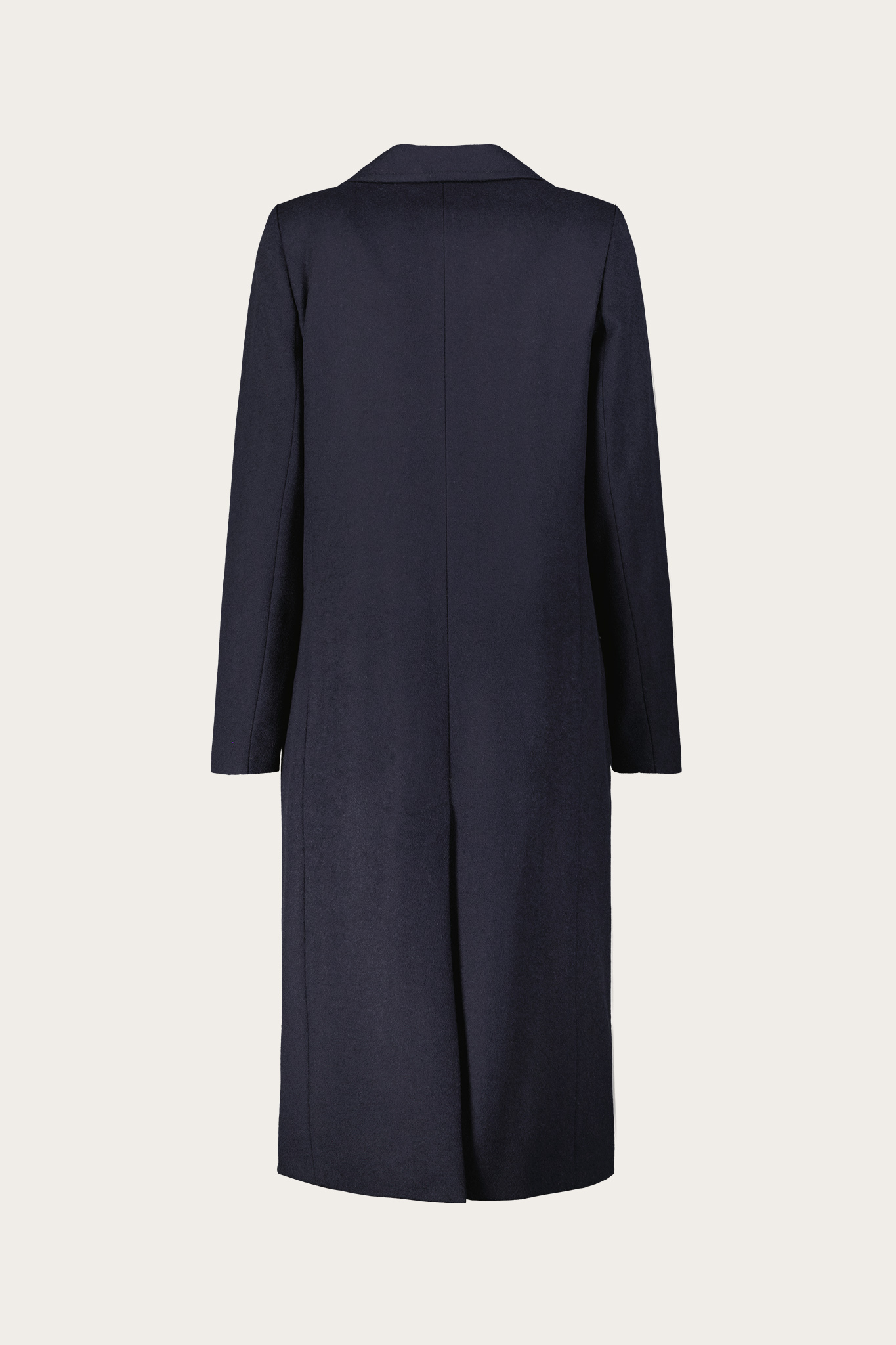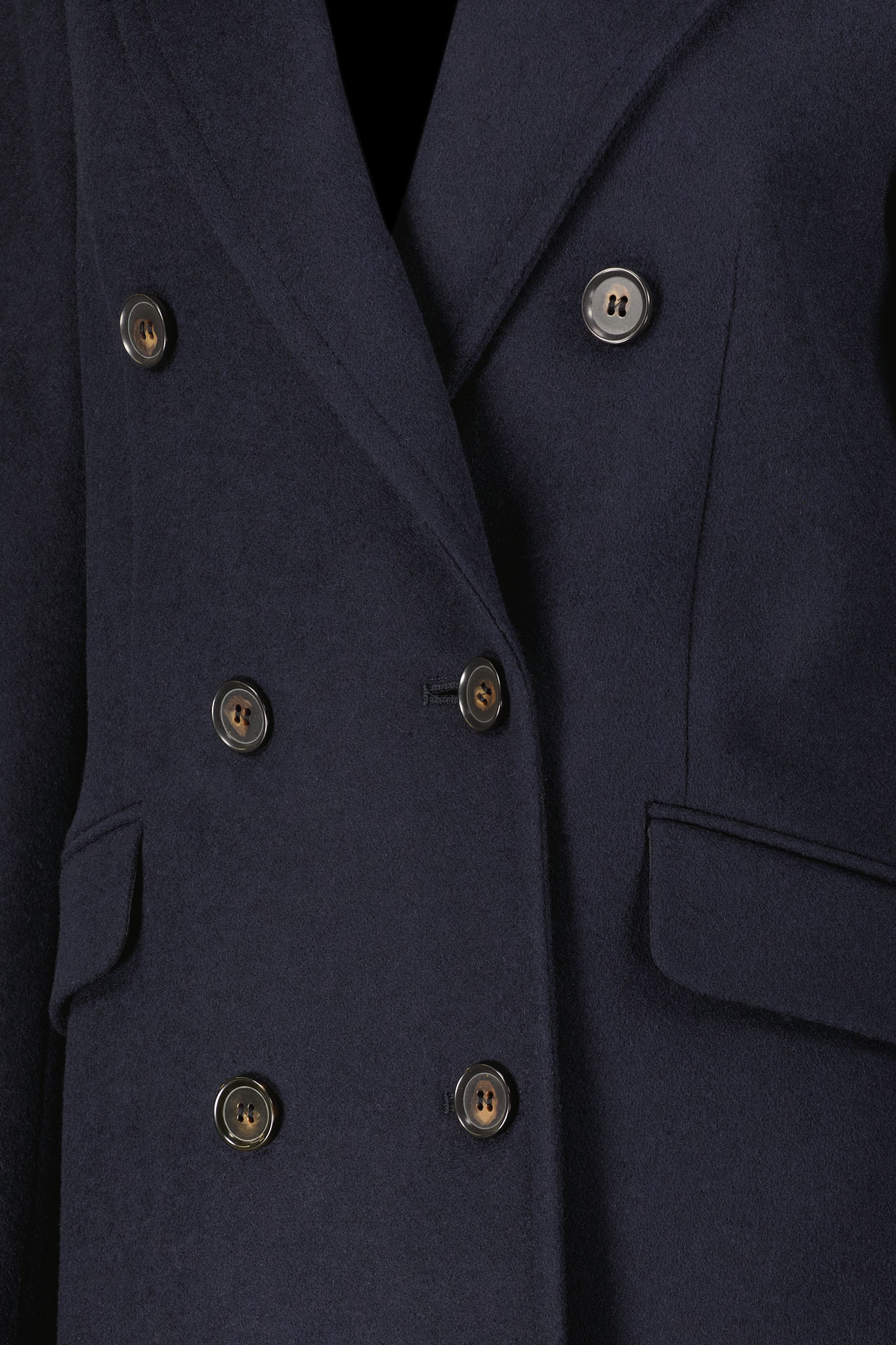 Granatowy dwurzędowy płaszcz wełniany z dodatkiem kaszmiru.