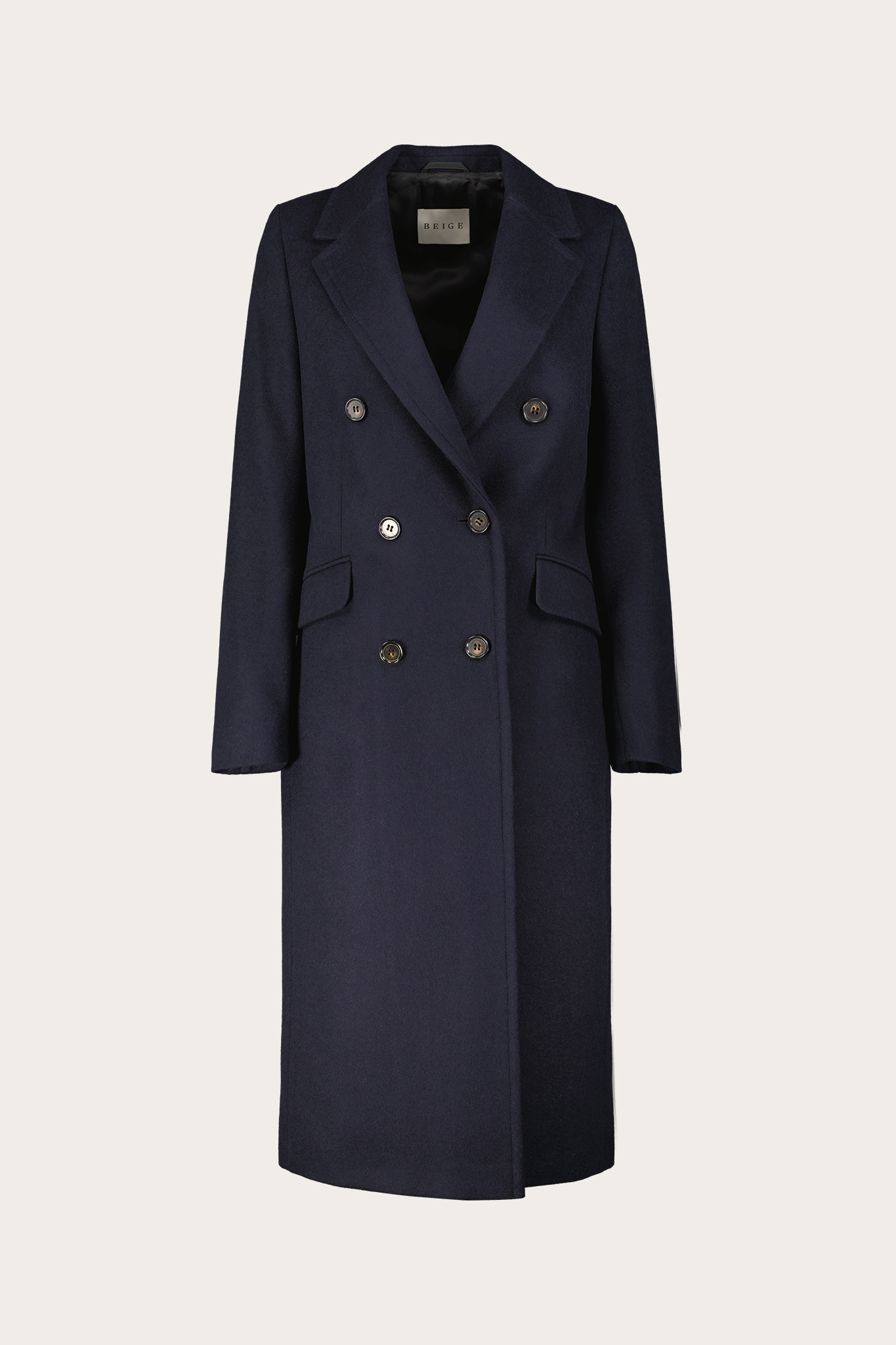 Klasyczny i nowoczesny płaszcz damski w intensywnym granacie. Model dwurzędowy z rozcięciem z tyłu. Dwie patki, które można schować do wewnątrz. Wnętrze wykończone podszewką wiskozową.